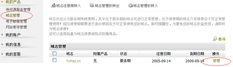 1)登陸會(huì)員區(qū),左邊我的產(chǎn)品,域名管理,選域名后面的管理
