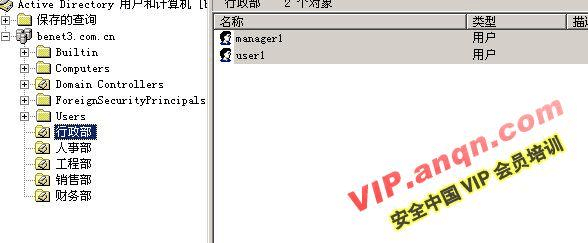 1) 使用“Active Directory用戶和計算機(jī)”,在行政部OU 中創(chuàng)建用戶帳戶“manager1“和“user1”