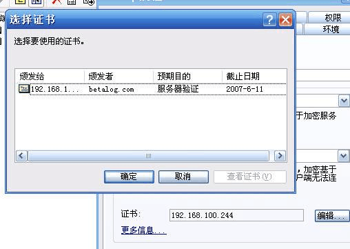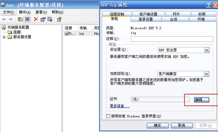 在管理工具中,打開終端服務配置,在左邊的窗格中單擊連接,然后在右邊雙擊連接,在彈出的對話框的常規(guī)選項卡中,首先單擊證書旁邊的編輯