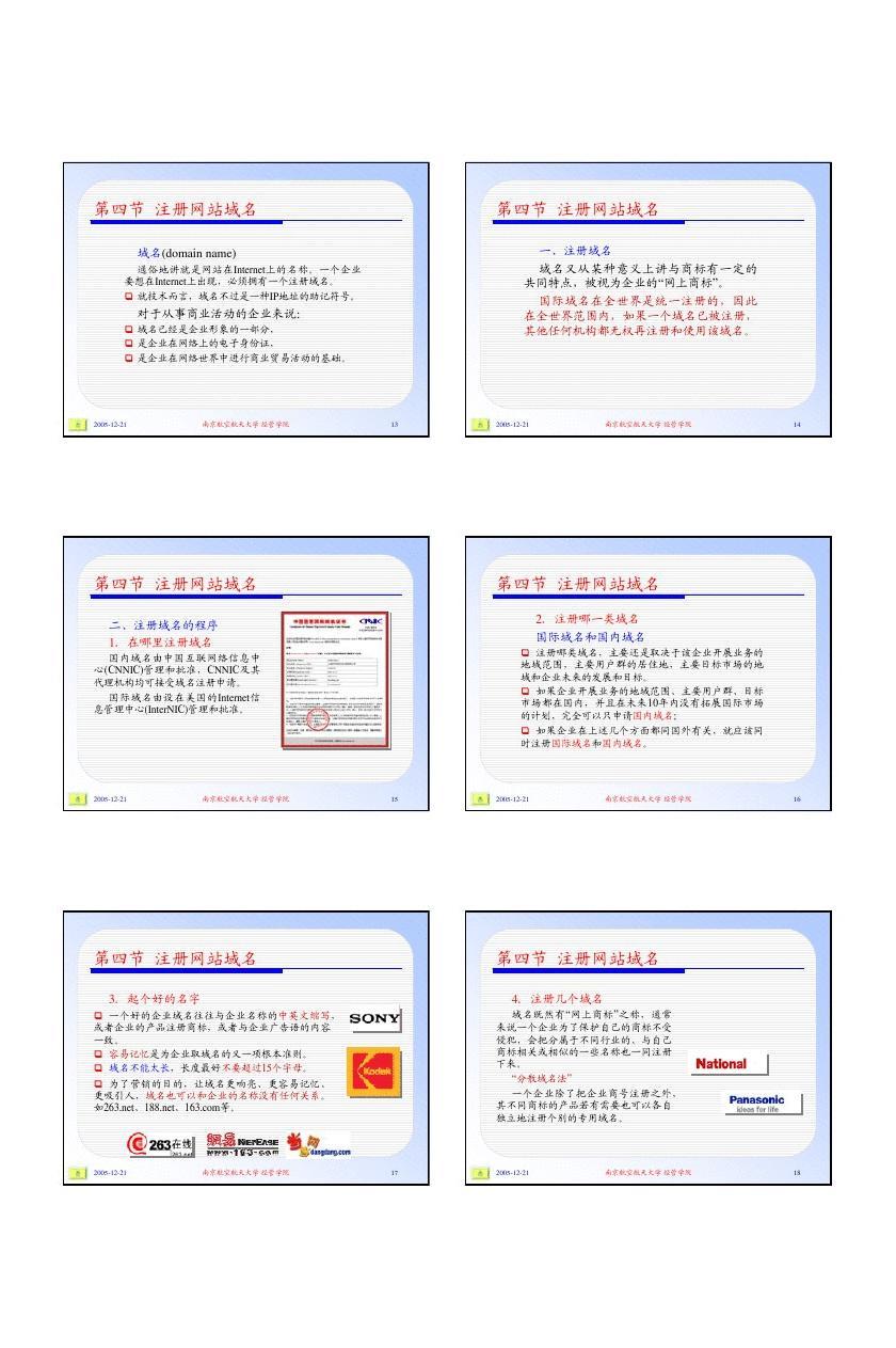 第十二章 電子商務(wù)網(wǎng)站建設(shè)n第一節(jié) 網(wǎng)站概述 第二節(jié) 網(wǎng)站建設(shè) 第三節(jié) 網(wǎng)站建設(shè)與發(fā)展步驟 第四節(jié) 注冊(cè)網(wǎng)站域名 第五節(jié) 網(wǎng)站設(shè)立方式 第六節(jié) 網(wǎng)頁(yè)制作 作業(yè)思考題nn第一節(jié) 網(wǎng)站概述n一、網(wǎng)站的定義n網(wǎng)站(website),是在Internet 上存儲(chǔ)文件的地方,以服務(wù)器 為載體。人們可以通過瀏覽器 訪問、查看網(wǎng)站文件,也可以 通過遠(yuǎn)程文件傳輸(FTP)方式上 載、下載網(wǎng)站文件。nn2005-12-21nn南京航空航天大學(xué) 經(jīng)管學(xué)院nn1nn2005-12-21nn南京航空航天大學(xué) 經(jīng)管學(xué)院nn2nn網(wǎng)站的功能nn第一節(jié) 網(wǎng)站概述n二、網(wǎng)站的種類n一般來說,網(wǎng)站從不同的角度進(jìn)行劃分,可以分為很多種 :nn網(wǎng)站是發(fā)布商務(wù)信息、實(shí)現(xiàn)商務(wù)管理和交易的重 要方式,是電子商務(wù)系統(tǒng)的“窗口”; 對(duì)于企業(yè)而言,網(wǎng)站是企業(yè)實(shí)施電子商務(wù)的基礎(chǔ) 設(shè)施和信息平臺(tái); 企業(yè)網(wǎng)址被稱為“網(wǎng)絡(luò)商標(biāo)”,是企業(yè)無形資產(chǎn)的 組成部分,而企業(yè)網(wǎng)站則是在網(wǎng)上宣傳和反映企 業(yè)形象和文化的重要窗口。nn從技術(shù)角度分nn靜態(tài)網(wǎng)站 動(dòng)態(tài)網(wǎng)站nn網(wǎng)站類型n從商業(yè)角度分nn商業(yè)網(wǎng)站 門戶網(wǎng)站 宣傳網(wǎng)站nn2005-12-21nn南京航空航天大學(xué) 經(jīng)管學(xué)院nn3nn2005-12-21nn南京航空航天大學(xué) 經(jīng)管學(xué)院nn4nn第一節(jié) 網(wǎng)站概述n靜態(tài)網(wǎng)站 是網(wǎng)站建設(shè)初期經(jīng)常采用的一種形式。網(wǎng)站 建設(shè)者把內(nèi)容設(shè)計(jì)成靜態(tài)網(wǎng)頁(yè),訪問者只能被 動(dòng)地瀏覽網(wǎng)站建設(shè)者提供的網(wǎng)頁(yè)內(nèi)容。 動(dòng)態(tài)網(wǎng)站 綜合利用靜態(tài)網(wǎng)頁(yè)、中間件、數(shù)據(jù)庫(kù)技術(shù), 實(shí)現(xiàn)網(wǎng)站與用戶之間的交互操作。根據(jù)用戶的 不同要求,網(wǎng)站能夠提供不同的信息,使訪問 者與網(wǎng)站之間能夠進(jìn)行信息交流。nn第一節(jié) 網(wǎng)站概述n商業(yè)網(wǎng)站n是從事商業(yè)活動(dòng)的網(wǎng)站,是以銷售商品為手段的贏 利性網(wǎng)站。如著名的商業(yè)網(wǎng)站美國(guó)的亞馬遜書店 (http://www.amazon.com)。nn門戶網(wǎng)站n向大眾提供信息服務(wù),提高站點(diǎn)訪問率和知名度, 以廣告收入作為贏利手段的網(wǎng)站。nn宣傳網(wǎng)站n是在Internet上樹立企業(yè)形象的網(wǎng)站,不參與商業(yè)活 動(dòng),是以宣傳為目的的網(wǎng)站。nn2005-12-21nn南京航空航天大學(xué) 經(jīng)管學(xué)院nn5nn2005-12-21nn南京航空航天大學(xué) 經(jīng)管學(xué)院nn6nn