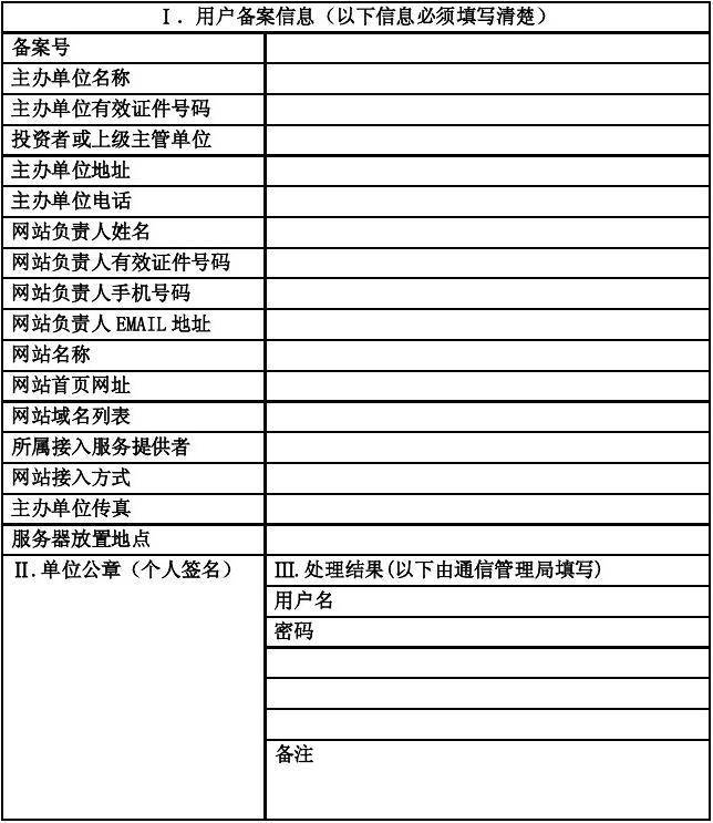 廣東省ICP 備案用戶找回用戶名、密碼申請(qǐng)表填表須知:1. 申請(qǐng)表用于存檔,請(qǐng)使用A4打印紙,紙張不符或未準(zhǔn)確清晰完整填寫者,視為無效申請(qǐng)。2. 找回用戶名和密碼必須提供蓋有公章的申請(qǐng)表、域名證書復(fù)印