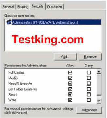 147.你是 TestKing.com 的網(wǎng)絡(luò)管理員. 網(wǎng)絡(luò)有一個(gè)單一活動(dòng)目錄域 testking.com . 所有的網(wǎng)絡(luò)服務(wù)器運(yùn)行Server 2003.一個(gè)叫做 TK1 的成員服務(wù)器上有一個(gè)叫public 的文件夾,該文件夾為域中所有的用戶存儲(chǔ)文件,public 位于NTFS 分區(qū),public 已經(jīng)配置的權(quán)限顯示如下: 1