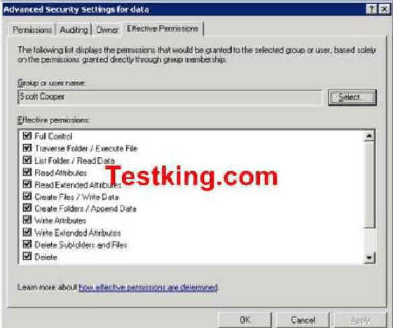 一個(gè)叫做Scott Cooper報(bào)告的使用者他能訪問Data ,但是他不能夠在文件夾里創(chuàng)建新文件. 你查看了對(duì)于data 的有效權(quán)限, 在下面被顯示.