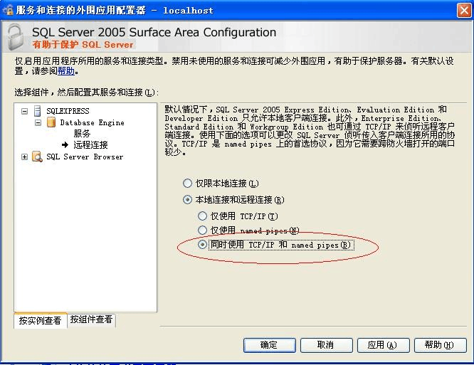 器”—“DATABASE ENGINE”—“遠(yuǎn)程連接”,選擇了" 同時(shí)使用TCP/IP和named pipes",確定,重啟服務(wù),在連接,還是失敗...