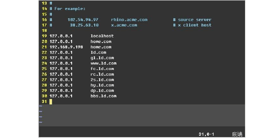 ,在這里將你所要定義的域名以及每個域名對應(yīng)的二級域名的IP 對應(yīng)組都登記在這個文件中。 最后重啟apache 就OK 了