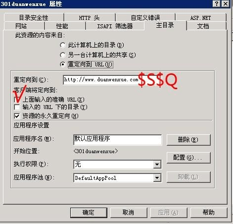 2. 在IIS 中選中剛才我們建立的站點,右鍵-屬性-主目錄,選擇重定向到,輸入網(wǎng)址如:xxxx ,同時注意選中下面的資源的永久重定向選項。