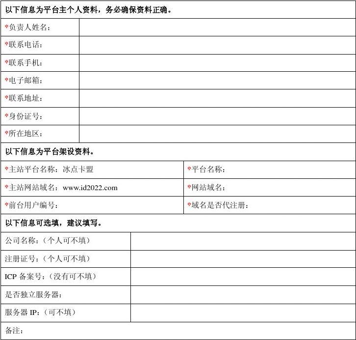 冰點卡盟下屬VIP 網(wǎng)站架設(shè)用戶資料表日期提示:1、以上資料中帶“*”為必填項目,將以此來確認(rèn)您的身份。2、網(wǎng)站域名可選擇智能解析服務(wù),該服務(wù)由第三方公司提供,冰點卡盟不確保服務(wù)質(zhì)量,該服務(wù)免費。智能
