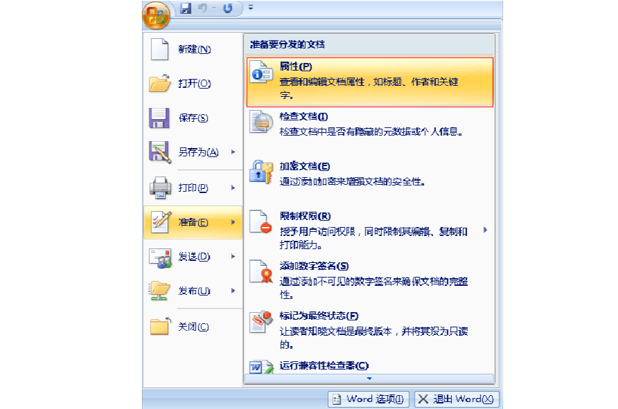 修改編輯word 2007 里的域名1、點(diǎn)擊word 窗體左上角的,點(diǎn)擊“準(zhǔn)備”,彈出如下:2、點(diǎn)擊“屬性”,出現(xiàn)如下視圖: ,3、進(jìn)一步點(diǎn)擊上圖中紅色橢圓區(qū)域,出現(xiàn)彈出框