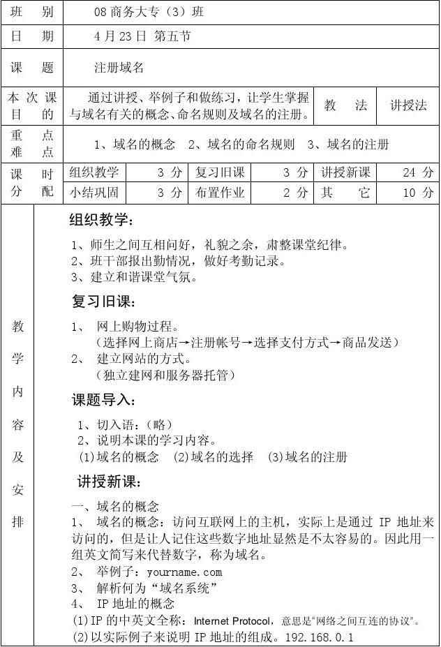 《注冊域名》教學(xué)設(shè)計(jì)與反思 2017-03-27 10717 廣東省肇慶市四會(huì)中等專業(yè)學(xué)校課時(shí)授課計(jì)劃1 , ,3 廣東省肇慶市四會(huì)中等專業(yè)學(xué)校課時(shí)授課計(jì)劃1 , ,3