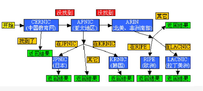 本機上的自動WHOIS 服務(wù),是按照下圖所示的流程,依次查詢?nèi)舾蓚€WHOIS 服務(wù)器之后,得到某個IP 地址的WHOIS 信息。
