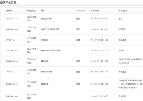 筆者是在阿里云備案系統(tǒng)備案的,在此不得不夸贊一下。拍照幕布免費且順豐郵寄(這個其他空間商代備案都要收費的) 而且審核速度非常的迅速(可看截圖) ,還有一點就是,這次備案核驗單只上傳了掃描件就完成了,之前備案的時