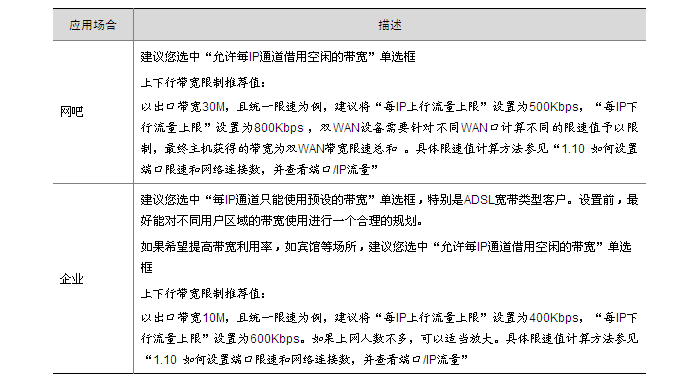 例如運(yùn)營(yíng)商帶寬為10Mbps ,帶機(jī)量100臺(tái)PC ,80的帶寬就是8Mbps ,20的人就是20個(gè)人,那么8Mbps*1000=8000kbps(實(shí)際上應(yīng)該乘以1024,這里簡(jiǎn)單以1000計(jì)算),8000kbps/20=400kbps,則理論值為每IP 需要下行限速400kbps ,上行值為200~300kbps ,當(dāng)然該計(jì)算值是理論值,需要根據(jù)實(shí)際的網(wǎng)絡(luò)使用量來(lái)適當(dāng)變化。如果是ADSL 寬帶類(lèi)型客戶,則上行帶寬建議限制為100kbps ,且不推薦允許每IP 通道借用空閑的帶寬。如果企業(yè)、酒店等環(huán)境,平時(shí)使用網(wǎng)絡(luò)的時(shí)間或者占用的流量不是很大,那么可以適當(dāng)將限速值調(diào)高,如下行600kbps ,上行400kbps ,并開(kāi)啟允許每IP 通道借用空閑的帶寬。如網(wǎng)吧環(huán)境,帶寬使用量較大,則需要增加帶寬或者較少帶機(jī)量來(lái)提高客戶網(wǎng)速的體驗(yàn),保證游戲和視頻的正常工作。網(wǎng)吧一般建議每IP 限速下行800kbps ,上行500kbps ,開(kāi)啟彈性帶寬功能,即允許每IP 通道借用空閑的帶寬。雙WAN 設(shè)備需要針對(duì)不同WAN 口計(jì)算不同的限速值予以限制,最終主機(jī)獲得的帶寬為雙WAN 帶寬限速總和。