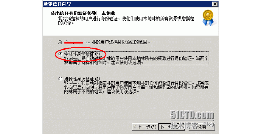 這里選擇林信任,林信任使得另一個(gè)林中的各個(gè)域中的用戶都可以在本林中可用域控制器匯總得到身份驗(yàn)證。相對(duì)外部信任而言,林信任放開的范圍很大,兩個(gè)林之間。