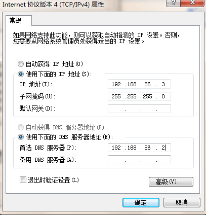 ⒉進行DNS 和IP 地址設置,打開開始—控制面板—本地連接—Internet 協議(Tcp/IP)屬性對話框,進行如下圖進行設置。