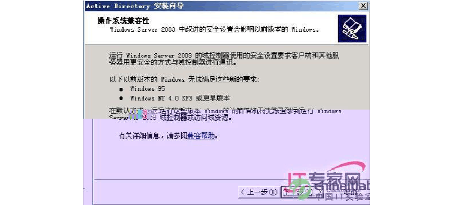 這里是一個(gè)兼容性的要求,Windows 95及NT 4 SP3以前的版本無法登陸運(yùn)行到Windows Server 2003的域控制器,我建議大家盡量采用Windows 2000及以上的操作系統(tǒng)來做為客戶端。然后點(diǎn)擊“下一步”: