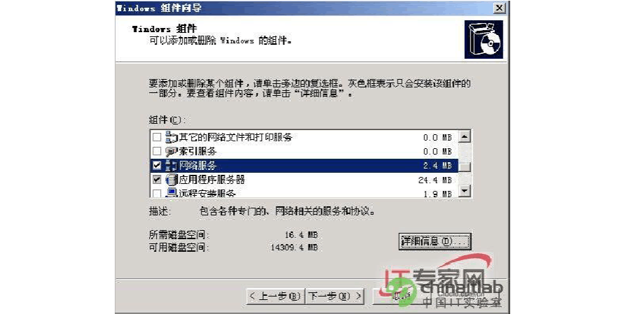 默認(rèn)情況下所有的網(wǎng)絡(luò)服務(wù)都會(huì)被添加,可以點(diǎn)擊下面的“詳細(xì)信息”進(jìn)行自定義安裝,由于在這里只需要DNS ,所以把其它的全都去掉了,以后需要的時(shí)候再安裝: