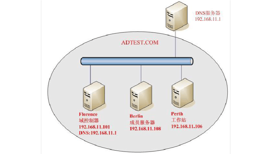 Active Directory ;一種是成員服務(wù)器,負(fù)責(zé)提供郵件、數(shù)據(jù)庫、DHCP 等服務(wù);還有一種是工作站,是用戶使用的客戶機(jī)。我們準(zhǔn)備搭建一個(gè)基本的域環(huán)境,拓?fù)淙鐖D6所示,F(xiàn)lorence 是域控制器,Berlin 是成員服務(wù)器,Perth 是工作站。