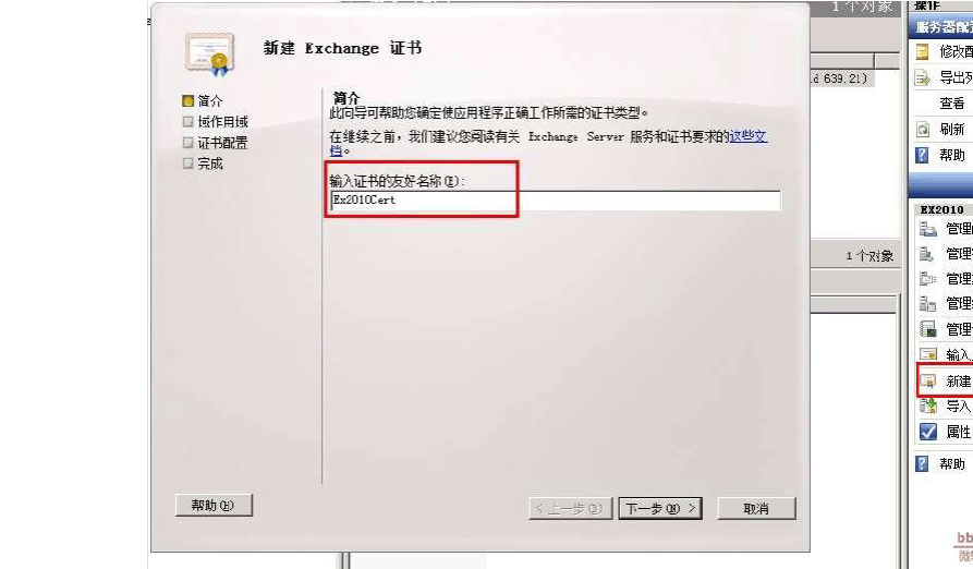 2. 新建一個Exchange 證書(Ex07是沒有這個的), 定義友好名字