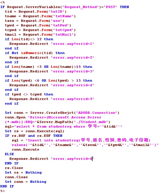 ,B 、編寫一個名為“receive.asp ”的注冊程序,將register .html 表單提交的數(shù)據(jù)以記錄方式插入到表studentReg 中。要求如下: 1)按圖1界面中的紅色文字要求在receiver .asp 中完成數(shù)據(jù)合法檢查,若不合法則編寫