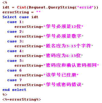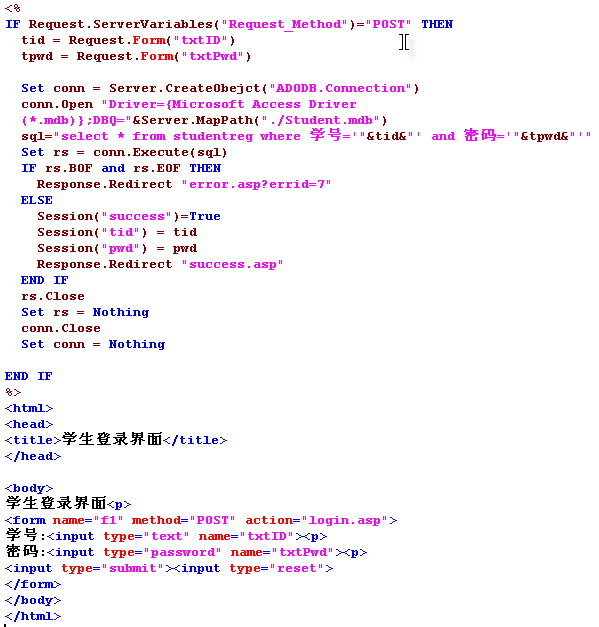 2、根據(jù)圖2的數(shù)據(jù)表和下面的界面圖3,編寫一個“l(fā)ogin.asp ”,當用戶輸入合法的學號和密碼后,在“success.asp ”中顯示學生的學號和密碼,并顯示“登錄成功”信息,否則在第1題編寫的“error .asp ”中顯示出錯信息。