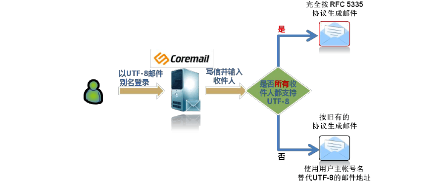 郵件的所有收件人所在系統(tǒng)都支持UTF-8郵件地址編碼的,則完全按 RFC 5335協(xié)議生成郵件。