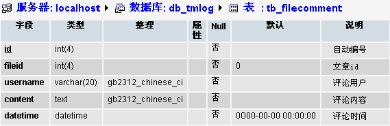 評論列表存儲的是用戶對文章的評論,包括注冊用戶和游客都可以發(fā)表評論。tb_filecomment表的