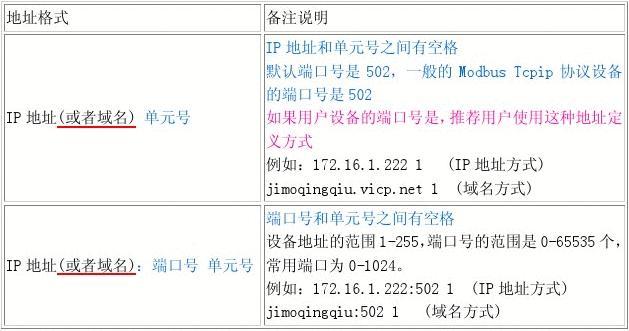 在此只介紹組態(tài)王中定義設(shè)備地址格式時(shí)如何使用域名。兩種不同的地址格式如下圖所示: