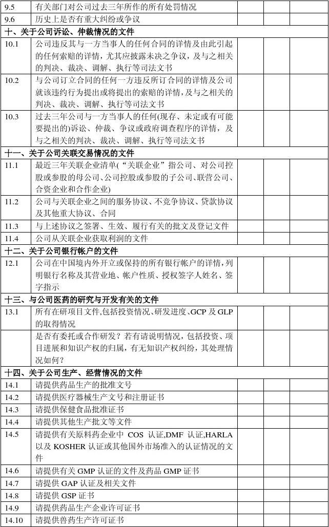 ,德恒律師事務所關于中國華源集團公司有限公司醫(yī)藥類企業(yè)盡職調查文件—盡職調查清單